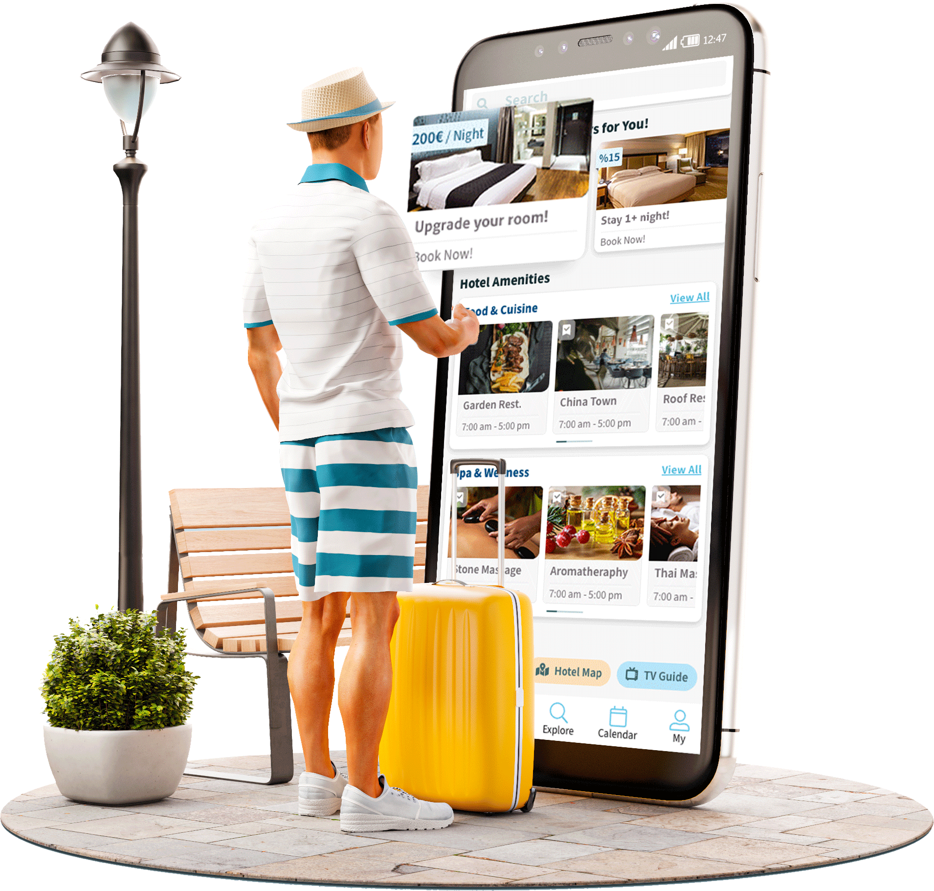 Aidez vos clients à explorer les installations de votre hôtel ou à proximité et à planifier leur séjour depuis leur téléphone